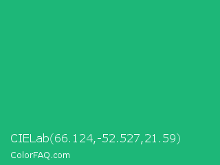 CIELab 66.124,-52.527,21.59 Color is a normal green color and the nearest color is Green Crayola #1cac78. Hex code #1db778 and RGB value is rgb(29,183,120). In RGB color space, this color is composed of 11% red, 72% green, 47% blue, In CMYK color space, this color is composed of 84% cyan, 0% magenta, 34% yellow , 28% black , In HSL color space, this color has a hue angle of 155° , 73% saturation and 42% lightness.