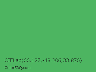 CIELab 66.127,-48.206,33.876 Color is a normal green color and the nearest color is Chateau Green #40a860. Hex code #4db561 and RGB value is rgb(77,181,97). In RGB color space, this color is composed of 30% red, 71% green, 38% blue, In CMYK color space, this color is composed of 57% cyan, 0% magenta, 46% yellow , 29% black , In HSL color space, this color has a hue angle of 132° , 41% saturation and 51% lightness.