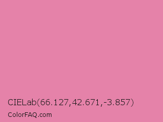 CIELab 66.127,42.671,-3.857 Color is a light rose color and the nearest color is Carissma #ea88a8. Hex code #e582a9 and RGB value is rgb(229,130,169). In RGB color space, this color is composed of 90% red, 51% green, 66% blue, In CMYK color space, this color is composed of 0% cyan, 43% magenta, 26% yellow , 10% black , In HSL color space, this color has a hue angle of 336° , 66% saturation and 70% lightness.