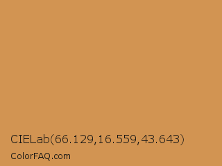 CIELab 66.129,16.559,43.643 Color is a normal orange color and the nearest color is Persian Orange #d99058. Hex code #d29452 and RGB value is rgb(210,148,82). In RGB color space, this color is composed of 82% red, 58% green, 32% blue, In CMYK color space, this color is composed of 0% cyan, 30% magenta, 61% yellow , 18% black , In HSL color space, this color has a hue angle of 31° , 59% saturation and 57% lightness.