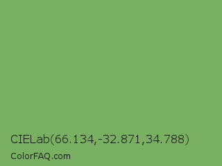 CIELab 66.134,-32.871,34.788 Color is a normal green color and the nearest color is Bud Green #7bb661. Hex code #78af60 and RGB value is rgb(120,175,96). In RGB color space, this color is composed of 47% red, 69% green, 38% blue, In CMYK color space, this color is composed of 31% cyan, 0% magenta, 45% yellow , 31% black , In HSL color space, this color has a hue angle of 102° , 33% saturation and 53% lightness.