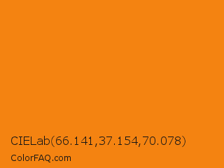 CIELab 66.141,37.154,70.078 Color is a normal orange color and the nearest color is Ecstasy #fa7814. Hex code #f48311 and RGB value is rgb(244,131,17). In RGB color space, this color is composed of 96% red, 51% green, 7% blue, In CMYK color space, this color is composed of 0% cyan, 46% magenta, 93% yellow , 4% black , In HSL color space, this color has a hue angle of 30° , 91% saturation and 51% lightness.