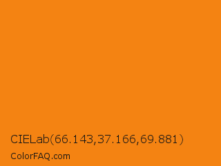 CIELab 66.143,37.166,69.881 Color is a normal orange color and the nearest color is Ecstasy #fa7814. Hex code #f48312 and RGB value is rgb(244,131,18). In RGB color space, this color is composed of 96% red, 51% green, 7% blue, In CMYK color space, this color is composed of 0% cyan, 46% magenta, 93% yellow , 4% black , In HSL color space, this color has a hue angle of 30° , 91% saturation and 51% lightness.