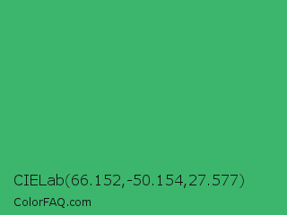 CIELab 66.152,-50.154,27.577 Color is a normal green color and the nearest color is Medium Sea Green #3cb371. Hex code #3cb66d and RGB value is rgb(60,182,109). In RGB color space, this color is composed of 24% red, 71% green, 43% blue, In CMYK color space, this color is composed of 67% cyan, 0% magenta, 40% yellow , 29% black , In HSL color space, this color has a hue angle of 144° , 50% saturation and 47% lightness.