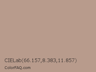 CIELab 66.157,8.383,11.857 Color is a light orange color and the nearest color is Quicksand #bd978e. Hex code #b89b8c and RGB value is rgb(184,155,140). In RGB color space, this color is composed of 72% red, 61% green, 55% blue, In CMYK color space, this color is composed of 0% cyan, 16% magenta, 24% yellow , 28% black , In HSL color space, this color has a hue angle of 20° , 24% saturation and 64% lightness.