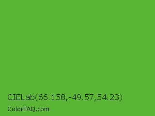 CIELab 66.158,-49.57,54.23 Color is a normal green color and the nearest color is Green RYB #66b032. Hex code #5bb535 and RGB value is rgb(91,181,53). In RGB color space, this color is composed of 36% red, 71% green, 21% blue, In CMYK color space, this color is composed of 50% cyan, 0% magenta, 71% yellow , 29% black , In HSL color space, this color has a hue angle of 102° , 55% saturation and 46% lightness.