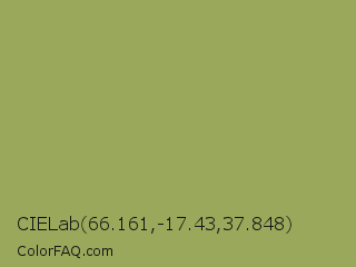 CIELab 66.161,-17.43,37.848 Color is a normal lime color and the nearest color is Moss Green #8a9a5b. Hex code #99a85b and RGB value is rgb(153,168,91). In RGB color space, this color is composed of 60% red, 66% green, 36% blue, In CMYK color space, this color is composed of 9% cyan, 0% magenta, 46% yellow , 34% black , In HSL color space, this color has a hue angle of 72° , 31% saturation and 51% lightness.