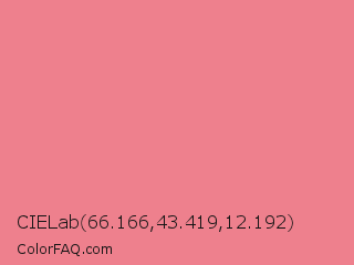 CIELab 66.166,43.419,12.192 Color is a light red color and the nearest color is Light Coral #f08080. Hex code #ee808d and RGB value is rgb(238,128,141). In RGB color space, this color is composed of 93% red, 50% green, 55% blue, In CMYK color space, this color is composed of 0% cyan, 46% magenta, 41% yellow , 7% black , In HSL color space, this color has a hue angle of 353° , 76% saturation and 72% lightness.