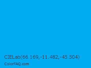 CIELab 66.169,-11.482,-45.504 Color is a normal blue color and the nearest color is Vivid Cerulean #00aaee. Hex code #01abf2 and RGB value is rgb(1,171,242). In RGB color space, this color is composed of 0% red, 67% green, 95% blue, In CMYK color space, this color is composed of 100% cyan, 29% magenta, 0% yellow , 5% black , In HSL color space, this color has a hue angle of 198° , 99% saturation and 48% lightness.