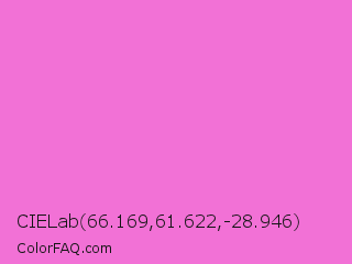 CIELab 66.169,61.622,-28.946 Color is a light magenta color and the nearest color is Rose Pink #ff66cc. Hex code #f271d6 and RGB value is rgb(242,113,214). In RGB color space, this color is composed of 95% red, 44% green, 84% blue, In CMYK color space, this color is composed of 0% cyan, 53% magenta, 12% yellow , 5% black , In HSL color space, this color has a hue angle of 313° , 83% saturation and 70% lightness.