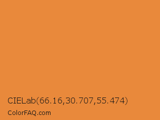 CIELab 66.16,30.707,55.474 Color is a normal orange color and the nearest color is Jaffa #ef863f. Hex code #e9893b and RGB value is rgb(233,137,59). In RGB color space, this color is composed of 91% red, 54% green, 23% blue, In CMYK color space, this color is composed of 0% cyan, 41% magenta, 75% yellow , 9% black , In HSL color space, this color has a hue angle of 27° , 80% saturation and 57% lightness.