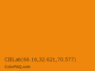 CIELab 66.16,32.621,70.577 Color is a normal orange color and the nearest color is Tangerine #f28500. Hex code #ee870c and RGB value is rgb(238,135,12). In RGB color space, this color is composed of 93% red, 53% green, 5% blue, In CMYK color space, this color is composed of 0% cyan, 43% magenta, 95% yellow , 7% black , In HSL color space, this color has a hue angle of 33° , 90% saturation and 49% lightness.