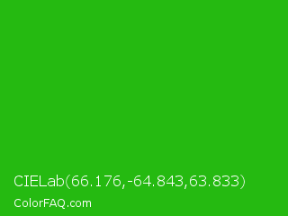 CIELab 66.176,-64.843,63.833 Color is a normal green color and the nearest color is Slimy Green #299617. Hex code #25ba11 and RGB value is rgb(37,186,17). In RGB color space, this color is composed of 15% red, 73% green, 7% blue, In CMYK color space, this color is composed of 80% cyan, 0% magenta, 91% yellow , 27% black , In HSL color space, this color has a hue angle of 113° , 83% saturation and 40% lightness.