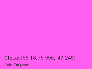 CIELab 66.18,76.996,-43.248 Color is a light magenta color and the nearest color is Pink Flamingo Crayola #ff66ff. Hex code #ff5ef0 and RGB value is rgb(255,94,240). In RGB color space, this color is composed of 100% red, 37% green, 94% blue, In CMYK color space, this color is composed of 0% cyan, 63% magenta, 6% yellow , 0% black , In HSL color space, this color has a hue angle of 306° , 100% saturation and 68% lightness.