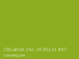 CIELab 66.192,-29.562,61.847 Color is a normal lime color and the nearest color is Citron #9fa91f. Hex code #8cad21 and RGB value is rgb(140,173,33). In RGB color space, this color is composed of 55% red, 68% green, 13% blue, In CMYK color space, this color is composed of 19% cyan, 0% magenta, 81% yellow , 32% black , In HSL color space, this color has a hue angle of 74° , 68% saturation and 40% lightness.