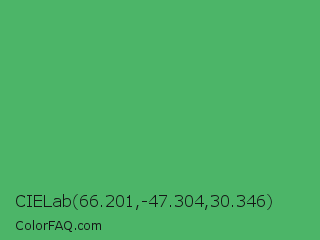 CIELab 66.201,-47.304,30.346 Color is a normal green color and the nearest color is Medium Sea Green #3cb371. Hex code #4cb568 and RGB value is rgb(76,181,104). In RGB color space, this color is composed of 30% red, 71% green, 41% blue, In CMYK color space, this color is composed of 58% cyan, 0% magenta, 43% yellow , 29% black , In HSL color space, this color has a hue angle of 136° , 42% saturation and 50% lightness.