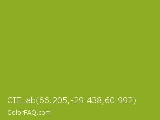 CIELab 66.205,-29.438,60.992 Color is a normal lime color and the nearest color is Citron #9fa91f. Hex code #8cad24 and RGB value is rgb(140,173,36). In RGB color space, this color is composed of 55% red, 68% green, 14% blue, In CMYK color space, this color is composed of 19% cyan, 0% magenta, 79% yellow , 32% black , In HSL color space, this color has a hue angle of 74° , 66% saturation and 41% lightness.