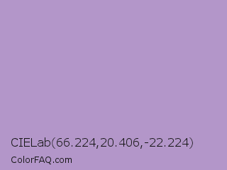 CIELab 66.224,20.406,-22.224 Color is a light purple color and the nearest color is East Side #ac91ce. Hex code #b396c9 and RGB value is rgb(179,150,201). In RGB color space, this color is composed of 70% red, 59% green, 79% blue, In CMYK color space, this color is composed of 11% cyan, 25% magenta, 0% yellow , 21% black , In HSL color space, this color has a hue angle of 274° , 32% saturation and 69% lightness.