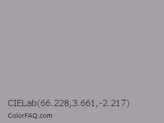 CIELab 66.228,3.661,-2.217 Color is a light magenta color and the nearest color is Quick Silver #a6a6a6. Hex code #a69fa5 and RGB value is rgb(166,159,165). In RGB color space, this color is composed of 65% red, 62% green, 65% blue, In CMYK color space, this color is composed of 0% cyan, 4% magenta, 1% yellow , 35% black , In HSL color space, this color has a hue angle of 309° , 4% saturation and 64% lightness.