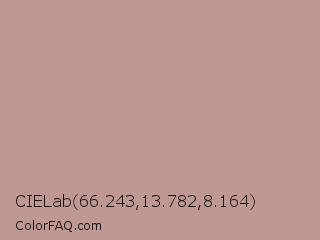 CIELab 66.243,13.782,8.164 Color is a light red color and the nearest color is Quicksand #bd978e. Hex code #bf9893 and RGB value is rgb(191,152,147). In RGB color space, this color is composed of 75% red, 60% green, 58% blue, In CMYK color space, this color is composed of 0% cyan, 20% magenta, 23% yellow , 25% black , In HSL color space, this color has a hue angle of 7° , 26% saturation and 66% lightness.