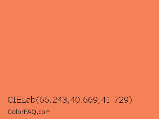 CIELab 66.243,40.669,41.729 Color is a light orange color and the nearest color is Coral #ff7f50. Hex code #f48158 and RGB value is rgb(244,129,88). In RGB color space, this color is composed of 96% red, 51% green, 35% blue, In CMYK color space, this color is composed of 0% cyan, 47% magenta, 64% yellow , 4% black , In HSL color space, this color has a hue angle of 16° , 88% saturation and 65% lightness.