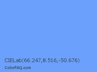 CIELab 66.247,8.516,-50.676 Color is a light blue color and the nearest color is Cornflower Blue #6495ed. Hex code #6ba1fc and RGB value is rgb(107,161,252). In RGB color space, this color is composed of 42% red, 63% green, 99% blue, In CMYK color space, this color is composed of 58% cyan, 36% magenta, 0% yellow , 1% black , In HSL color space, this color has a hue angle of 218° , 96% saturation and 70% lightness.