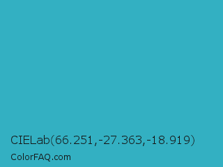 CIELab 66.251,-27.363,-18.919 Color is a normal cyan color and the nearest color is Pelorous #3eabbf. Hex code #33b0c2 and RGB value is rgb(51,176,194). In RGB color space, this color is composed of 20% red, 69% green, 76% blue, In CMYK color space, this color is composed of 74% cyan, 9% magenta, 0% yellow , 24% black , In HSL color space, this color has a hue angle of 188° , 58% saturation and 48% lightness.