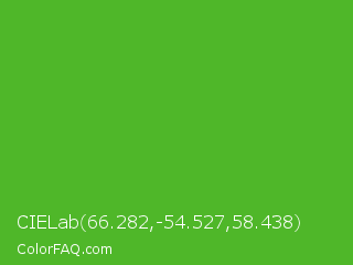 CIELab 66.282,-54.527,58.438 Color is a normal green color and the nearest color is Kelly Green #4cbb17. Hex code #4fb729 and RGB value is rgb(79,183,41). In RGB color space, this color is composed of 31% red, 72% green, 16% blue, In CMYK color space, this color is composed of 57% cyan, 0% magenta, 78% yellow , 28% black , In HSL color space, this color has a hue angle of 104° , 63% saturation and 44% lightness.