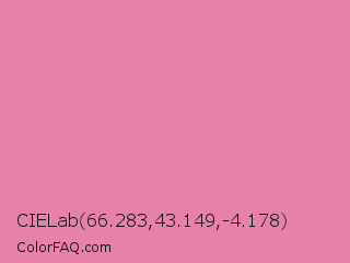 CIELab 66.283,43.149,-4.178 Color is a light rose color and the nearest color is Carissma #ea88a8. Hex code #e682aa and RGB value is rgb(230,130,170). In RGB color space, this color is composed of 90% red, 51% green, 67% blue, In CMYK color space, this color is composed of 0% cyan, 43% magenta, 26% yellow , 10% black , In HSL color space, this color has a hue angle of 336° , 67% saturation and 71% lightness.
