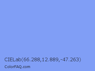 CIELab 66.288,12.889,-47.263 Color is a light blue color and the nearest color is Portage #8b9fee. Hex code #809ef6 and RGB value is rgb(128,158,246). In RGB color space, this color is composed of 50% red, 62% green, 96% blue, In CMYK color space, this color is composed of 48% cyan, 36% magenta, 0% yellow , 4% black , In HSL color space, this color has a hue angle of 225° , 87% saturation and 73% lightness.