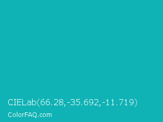 CIELab 66.28,-35.692,-11.719 Color is a normal cyan color and the nearest color is Tiffany Blue #0abab5. Hex code #10b3b5 and RGB value is rgb(16,179,181). In RGB color space, this color is composed of 6% red, 70% green, 71% blue, In CMYK color space, this color is composed of 91% cyan, 1% magenta, 0% yellow , 29% black , In HSL color space, this color has a hue angle of 181° , 84% saturation and 39% lightness.