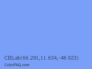 CIELab 66.291,11.634,-48.923 Color is a light blue color and the nearest color is Portage #8b9fee. Hex code #799ff9 and RGB value is rgb(121,159,249). In RGB color space, this color is composed of 47% red, 62% green, 98% blue, In CMYK color space, this color is composed of 51% cyan, 36% magenta, 0% yellow , 2% black , In HSL color space, this color has a hue angle of 222° , 91% saturation and 73% lightness.