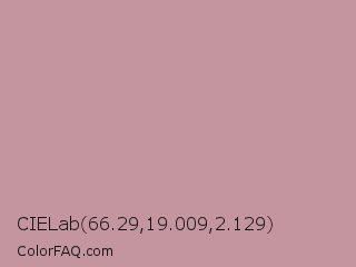 CIELab 66.29,19.009,2.129 Color is a light red color and the nearest color is Tuscany #c09999. Hex code #c4959e and RGB value is rgb(196,149,158). In RGB color space, this color is composed of 77% red, 58% green, 62% blue, In CMYK color space, this color is composed of 0% cyan, 24% magenta, 19% yellow , 23% black , In HSL color space, this color has a hue angle of 349° , 28% saturation and 68% lightness.