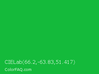 CIELab 66.2,-63.83,51.417 Color is a normal green color and the nearest color is Dark Pastel Green #03c03c. Hex code #14ba3b and RGB value is rgb(20,186,59). In RGB color space, this color is composed of 8% red, 73% green, 23% blue, In CMYK color space, this color is composed of 89% cyan, 0% magenta, 68% yellow , 27% black , In HSL color space, this color has a hue angle of 134° , 81% saturation and 40% lightness.