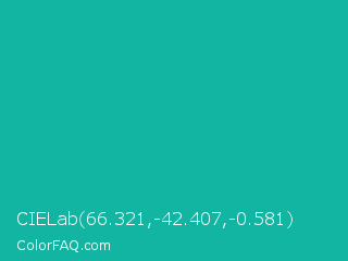 CIELab 66.321,-42.407,-0.581 Color is a normal cyan color and the nearest color is Light Sea Green #20b2aa. Hex code #11b5a1 and RGB value is rgb(17,181,161). In RGB color space, this color is composed of 7% red, 71% green, 63% blue, In CMYK color space, this color is composed of 91% cyan, 0% magenta, 11% yellow , 29% black , In HSL color space, this color has a hue angle of 173° , 83% saturation and 39% lightness.