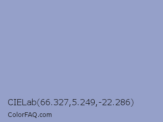 CIELab 66.327,5.249,-22.286 Color is a light blue color and the nearest color is Ceil #92a1cf. Hex code #95a0c9 and RGB value is rgb(149,160,201). In RGB color space, this color is composed of 58% red, 63% green, 79% blue, In CMYK color space, this color is composed of 26% cyan, 20% magenta, 0% yellow , 21% black , In HSL color space, this color has a hue angle of 227° , 33% saturation and 69% lightness.