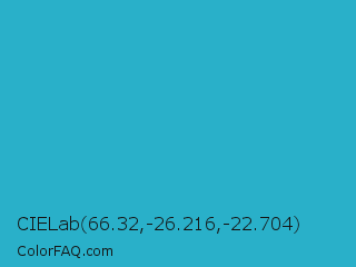 CIELab 66.32,-26.216,-22.704 Color is a normal cyan color and the nearest color is Ball Blue #21abcd. Hex code #29b0c9 and RGB value is rgb(41,176,201). In RGB color space, this color is composed of 16% red, 69% green, 79% blue, In CMYK color space, this color is composed of 80% cyan, 12% magenta, 0% yellow , 21% black , In HSL color space, this color has a hue angle of 189° , 66% saturation and 47% lightness.