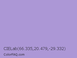 CIELab 66.335,20.479,-29.332 Color is a light indigo color and the nearest color is Light Pastel Purple #b19cd9. Hex code #ac97d6 and RGB value is rgb(172,151,214). In RGB color space, this color is composed of 67% red, 59% green, 84% blue, In CMYK color space, this color is composed of 20% cyan, 29% magenta, 0% yellow , 16% black , In HSL color space, this color has a hue angle of 260° , 43% saturation and 72% lightness.