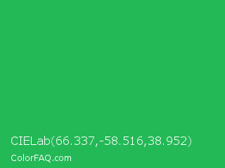 CIELab 66.337,-58.516,38.952 Color is a normal green color and the nearest color is Chateau Green #40a860. Hex code #24b957 and RGB value is rgb(36,185,87). In RGB color space, this color is composed of 14% red, 73% green, 34% blue, In CMYK color space, this color is composed of 81% cyan, 0% magenta, 53% yellow , 27% black , In HSL color space, this color has a hue angle of 141° , 67% saturation and 43% lightness.