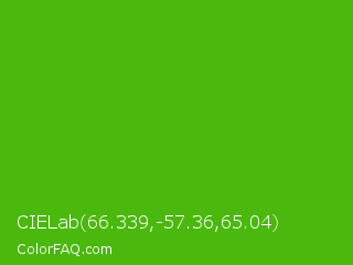CIELab 66.339,-57.36,65.04 Color is a normal green color and the nearest color is Kelly Green #4cbb17. Hex code #4ab80c and RGB value is rgb(74,184,12). In RGB color space, this color is composed of 29% red, 72% green, 5% blue, In CMYK color space, this color is composed of 60% cyan, 0% magenta, 93% yellow , 28% black , In HSL color space, this color has a hue angle of 98° , 88% saturation and 38% lightness.