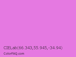 CIELab 66.343,55.945,-34.94 Color is a light magenta color and the nearest color is Orchid #da70d6. Hex code #e579e1 and RGB value is rgb(229,121,225). In RGB color space, this color is composed of 90% red, 47% green, 88% blue, In CMYK color space, this color is composed of 0% cyan, 47% magenta, 2% yellow , 10% black , In HSL color space, this color has a hue angle of 302° , 68% saturation and 69% lightness.