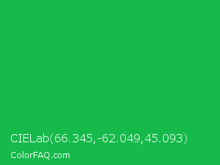 CIELab 66.345,-62.049,45.093 Color is a normal green color and the nearest color is Dark Pastel Green #03c03c. Hex code #15ba4a and RGB value is rgb(21,186,74). In RGB color space, this color is composed of 8% red, 73% green, 29% blue, In CMYK color space, this color is composed of 89% cyan, 0% magenta, 60% yellow , 27% black , In HSL color space, this color has a hue angle of 139° , 80% saturation and 41% lightness.