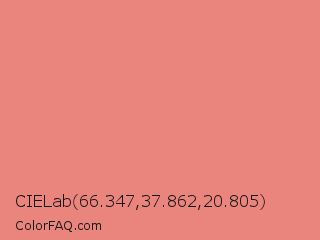 CIELab 66.347,37.862,20.805 Color is a light red color and the nearest color is Light Coral #f08080. Hex code #ea857e and RGB value is rgb(234,133,126). In RGB color space, this color is composed of 92% red, 52% green, 49% blue, In CMYK color space, this color is composed of 0% cyan, 43% magenta, 46% yellow , 8% black , In HSL color space, this color has a hue angle of 4° , 72% saturation and 71% lightness.