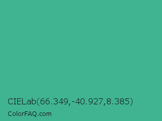 CIELab 66.349,-40.927,8.385 Color is a normal green color and the nearest color is Mint #3eb489. Hex code #40b491 and RGB value is rgb(64,180,145). In RGB color space, this color is composed of 25% red, 71% green, 57% blue, In CMYK color space, this color is composed of 64% cyan, 0% magenta, 19% yellow , 29% black , In HSL color space, this color has a hue angle of 162° , 48% saturation and 48% lightness.