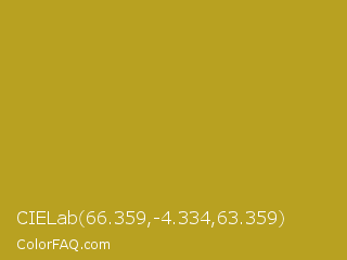 CIELab 66.359,-4.334,63.359 Color is a normal yellow color and the nearest color is Lucky #af9f1c. Hex code #b8a121 and RGB value is rgb(184,161,33). In RGB color space, this color is composed of 72% red, 63% green, 13% blue, In CMYK color space, this color is composed of 0% cyan, 13% magenta, 82% yellow , 28% black , In HSL color space, this color has a hue angle of 51° , 70% saturation and 43% lightness.