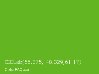 CIELab 66.375,-48.329,61.17 Color is a normal green color and the nearest color is Green RYB #66b032. Hex code #63b521 and RGB value is rgb(99,181,33). In RGB color space, this color is composed of 39% red, 71% green, 13% blue, In CMYK color space, this color is composed of 45% cyan, 0% magenta, 82% yellow , 29% black , In HSL color space, this color has a hue angle of 93° , 69% saturation and 42% lightness.