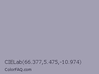 CIELab 66.377,5.475,-10.974 Color is a light indigo color and the nearest color is Santas Gray #9fa0b1. Hex code #a29fb5 and RGB value is rgb(162,159,181). In RGB color space, this color is composed of 64% red, 62% green, 71% blue, In CMYK color space, this color is composed of 10% cyan, 12% magenta, 0% yellow , 29% black , In HSL color space, this color has a hue angle of 248° , 13% saturation and 67% lightness.