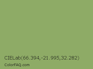 CIELab 66.394,-21.995,32.282 Color is a normal green color and the nearest color is Asparagus #87a96b. Hex code #8eab66 and RGB value is rgb(142,171,102). In RGB color space, this color is composed of 56% red, 67% green, 40% blue, In CMYK color space, this color is composed of 17% cyan, 0% magenta, 40% yellow , 33% black , In HSL color space, this color has a hue angle of 85° , 29% saturation and 54% lightness.