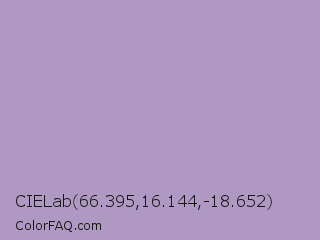 CIELab 66.395,16.144,-18.652 Color is a light purple color and the nearest color is East Side #ac91ce. Hex code #af99c3 and RGB value is rgb(175,153,195). In RGB color space, this color is composed of 69% red, 60% green, 76% blue, In CMYK color space, this color is composed of 10% cyan, 22% magenta, 0% yellow , 24% black , In HSL color space, this color has a hue angle of 271° , 26% saturation and 68% lightness.