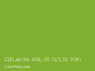 CIELab 66.408,-35.013,56.938 Color is a normal green color and the nearest color is Sushi #87ab39. Hex code #80b030 and RGB value is rgb(128,176,48). In RGB color space, this color is composed of 50% red, 69% green, 19% blue, In CMYK color space, this color is composed of 27% cyan, 0% magenta, 73% yellow , 31% black , In HSL color space, this color has a hue angle of 83° , 57% saturation and 44% lightness.